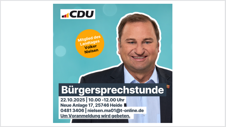 Sie haben Fragen, Anliegen oder Anregungen zur Landespolitik oder zu Themen, die Sie und Ihre Gemeinde bewegen? Dann nutzen Sie die Gelegenheit zum persönlichen Austausch mit unserem Landtagsabgeordneten Volker Nielsen!