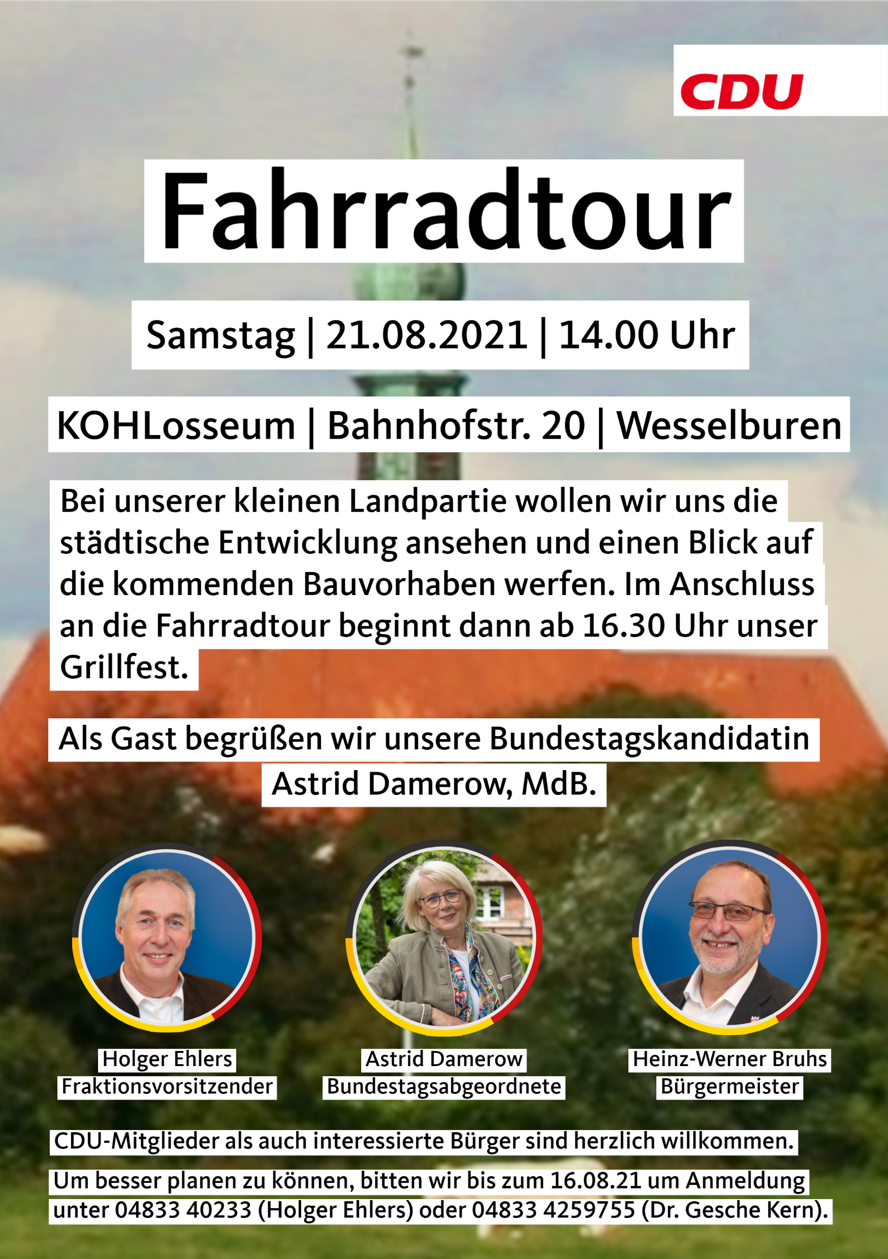 Bei unserer kleinen Landpartie wollen wir uns die städtische Entwicklung ansehen und einen Blick auf die kommenden Bauvorhaben werfen. Im Anschluss an die Fahrradtour beginnt dann ab 16.30 Uhr unser Grillfest.